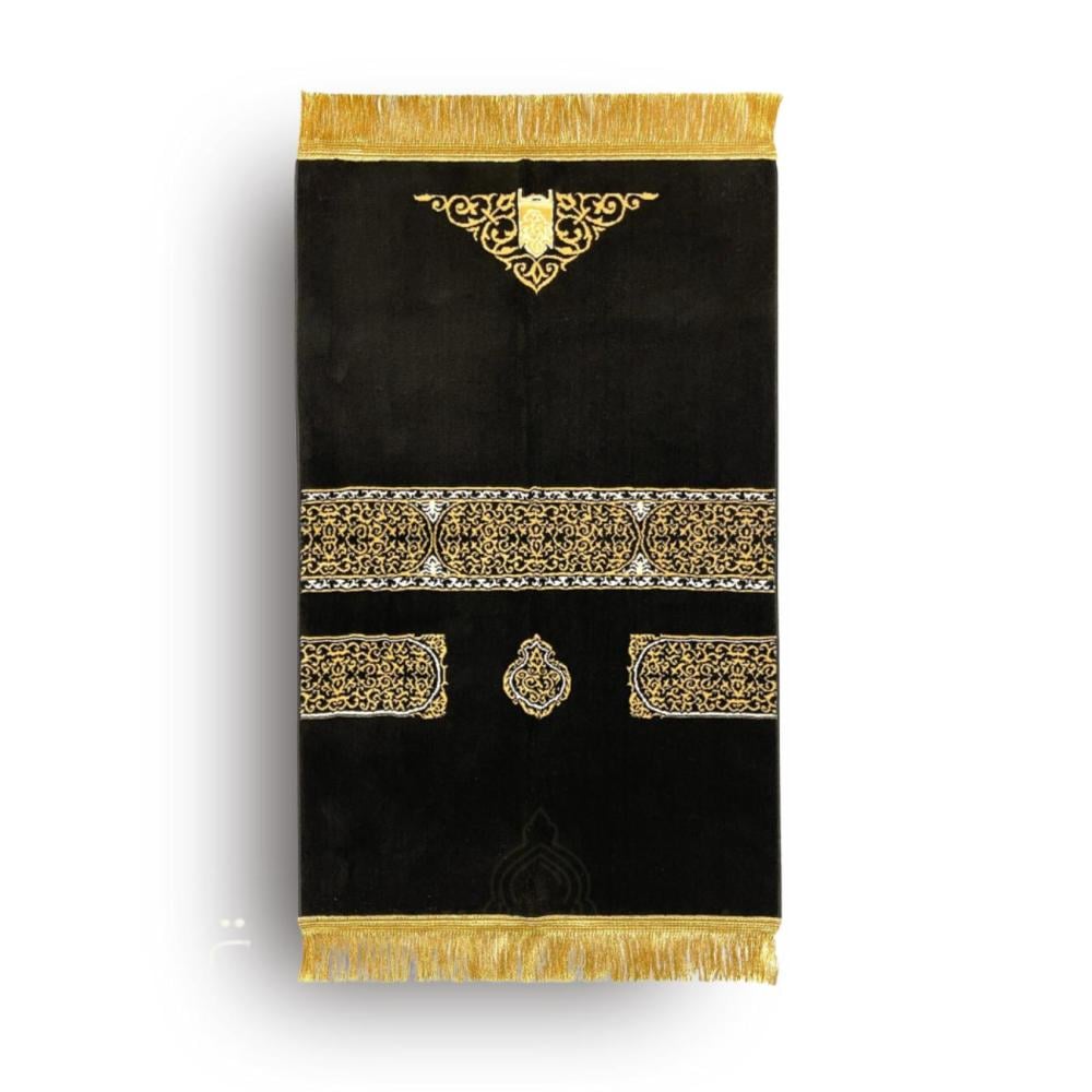 سجادة صلاة فاخرة بلونها الأسود الداكن وبتصميم مستوحى من الكعبة الشريفة .